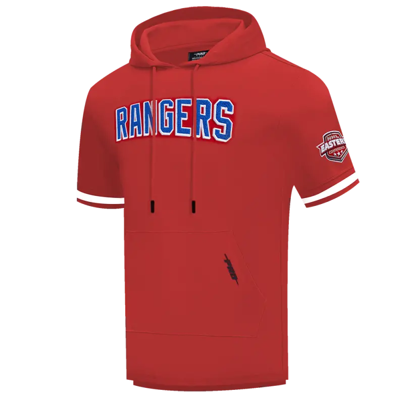 NHL NEW YORK RANGERS CLASSIC CHENILLE MEN’S DOUBLE KNIT SHORT SLEEVE PULLOVER HOODIE (RED)