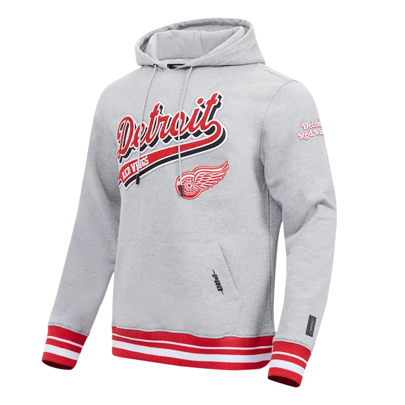 NHL DETROIT RED WINGS SCRIPT TAIL MEN’S RIB FLEECE PULLOVER HOODIE (HEATHER GRAY\/RED)