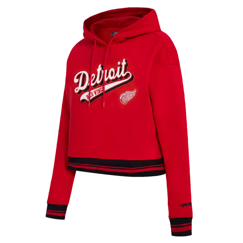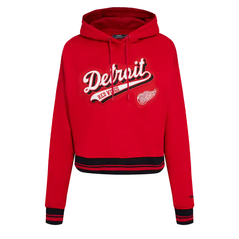 NHL DETROIT RED WINGS SCRIPT TAIL WOMEN’S RIB FLEECE CROPPED PULLOVER HOODIE (RED\/BLACK)
